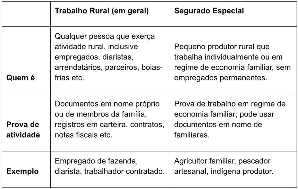 - As diferenças entre trabalho rural e segurado especial;
